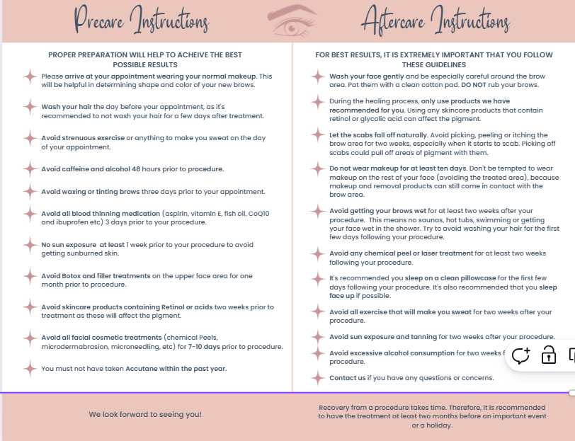 Please schedule your 6 - 8 week touch-up appointment before leaving. This second appointment will be shorter than your initial session and will include only the tattooing process—no pre-draw. Do not skip this appointment, as it is a crucial part of achieving optimal results.